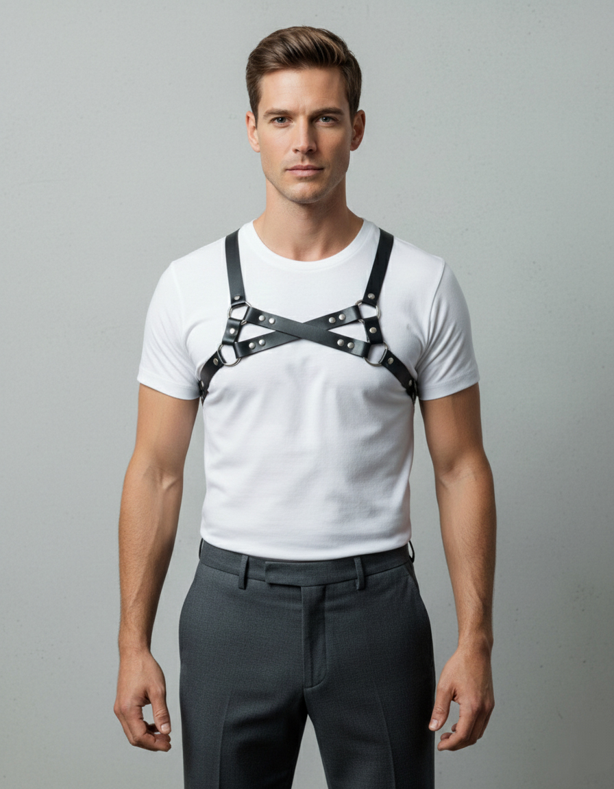 This versatile leather harness accessory complements alternative, modern, and street fashion styles and is intended for visual styling and outfit coordination.