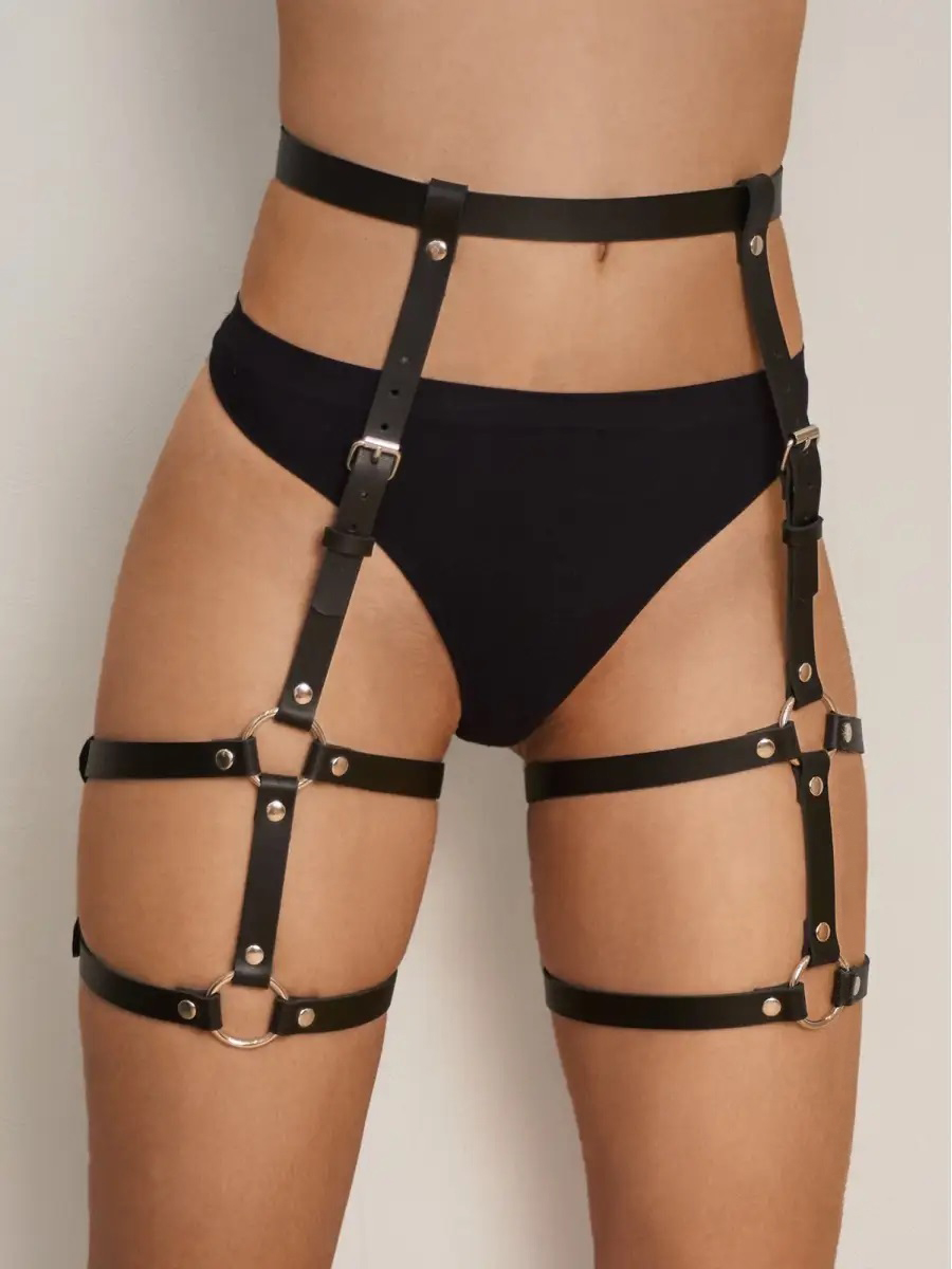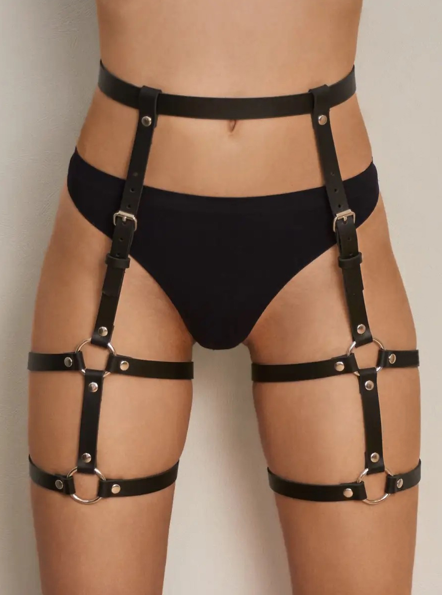 This leather harness accessory complements modern, alternative, and street fashion styles and is intended for visual styling and outfit coordination purposes only.